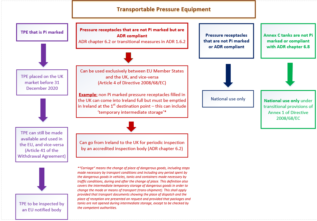 Note: In the UK, non pi marked TPE that is not ADR compliant is also restricted to national carriage within the UK. See: Carriage of Dangerous Goods and Use of Transportable Pressure Equipment Regulations 2009, as amended and Carriage of Dangerous Goods and Use of Transportable Pressure Equipment Regulations (Northern Ireland) 2010, as amended.