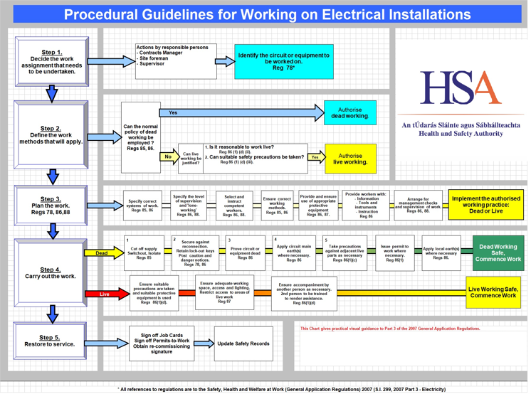 While the use of electricity at work is regulated by several pieces of legislation, the specific piece of legislation where electricity is addressed most directly is in Part 3 (Regulation 74 to 93) of the 2007 Safety Health & Welfare at Work (General Application) Regulations. Comprehensive guidelines on these Regulations are available here: Guidelines to Part 3 of the 2007 General Applications Regulations.