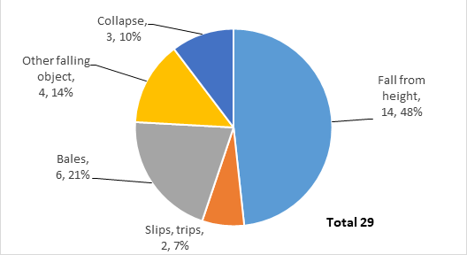 Falls from a height are the major cause of accidents involving farm buildings. Of particular concern is falling through fragile roofs and from ladders. Collapsing walls or earthen drains also cause deaths.